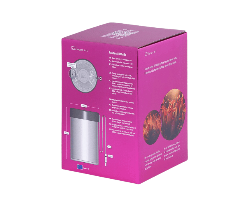 Ein besonderes Highlight ist die verstellbare Belüftungsöffnung, mit der sich die Luftfeuchtigkeit im Inneren einfach regulieren lässt. So lassen sich verschiedenste Mikroklimate nachbilden – vom feuchten Tropenwald bis zur gemäßigten Mooslandschaft. Die integrierte LED-Lampe (3,8 Watt) arbeitet energiesparend, verfügt über umschaltbare Lichtintensitäten und wird über einen USB-A-Anschluss betrieben (Netzteil nicht enthalten).