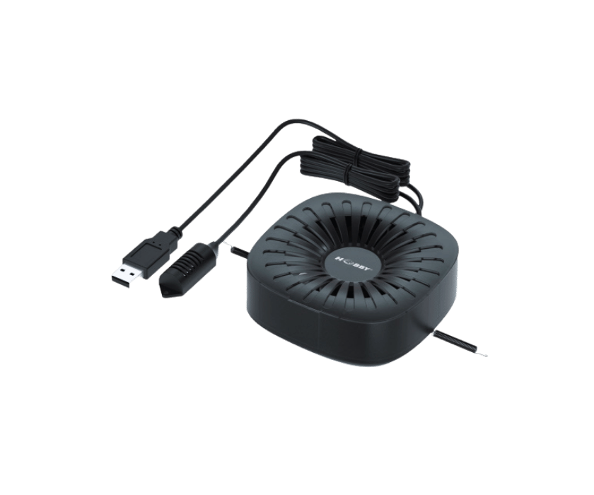 Das kompakte Design erlaubt eine flexible Montage im Terrarium. Der Betrieb erfolgt über ein handelsübliches USB-Netzteil (nicht im Lieferumfang enthalten).